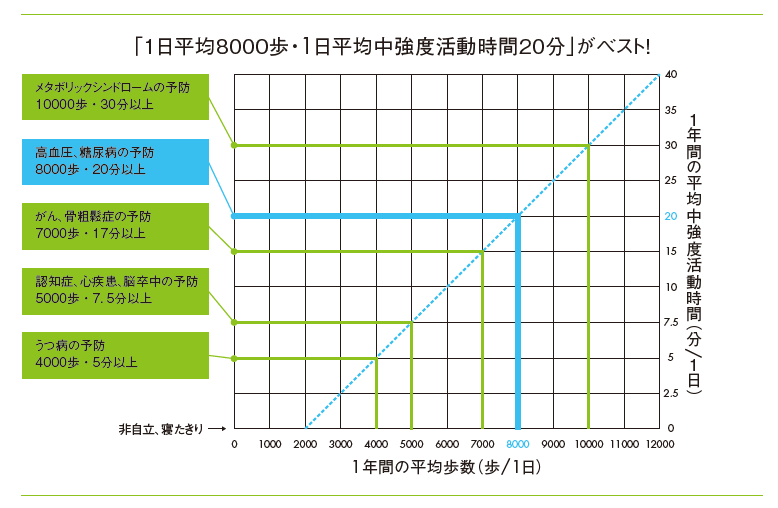 例えば 「一日平均4000歩以上・一日平均中強度活動時間5分以上ならうつ病や睡眠障害の予防」、同様に一日平均「5000歩以上・7.5分以上なら認知症、心疾患、脳卒中の予防」「7000歩以上・15分以上ならがんや骨粗鬆症、動脈硬化の予防」「8000歩以上・20分以上なら高血圧症や糖尿病、脂質異常症の予防」というように、平均歩数と平均中強度活動時間と有病率・罹患率の間には密接な関連があるということがわかったのです。